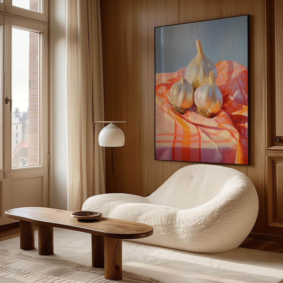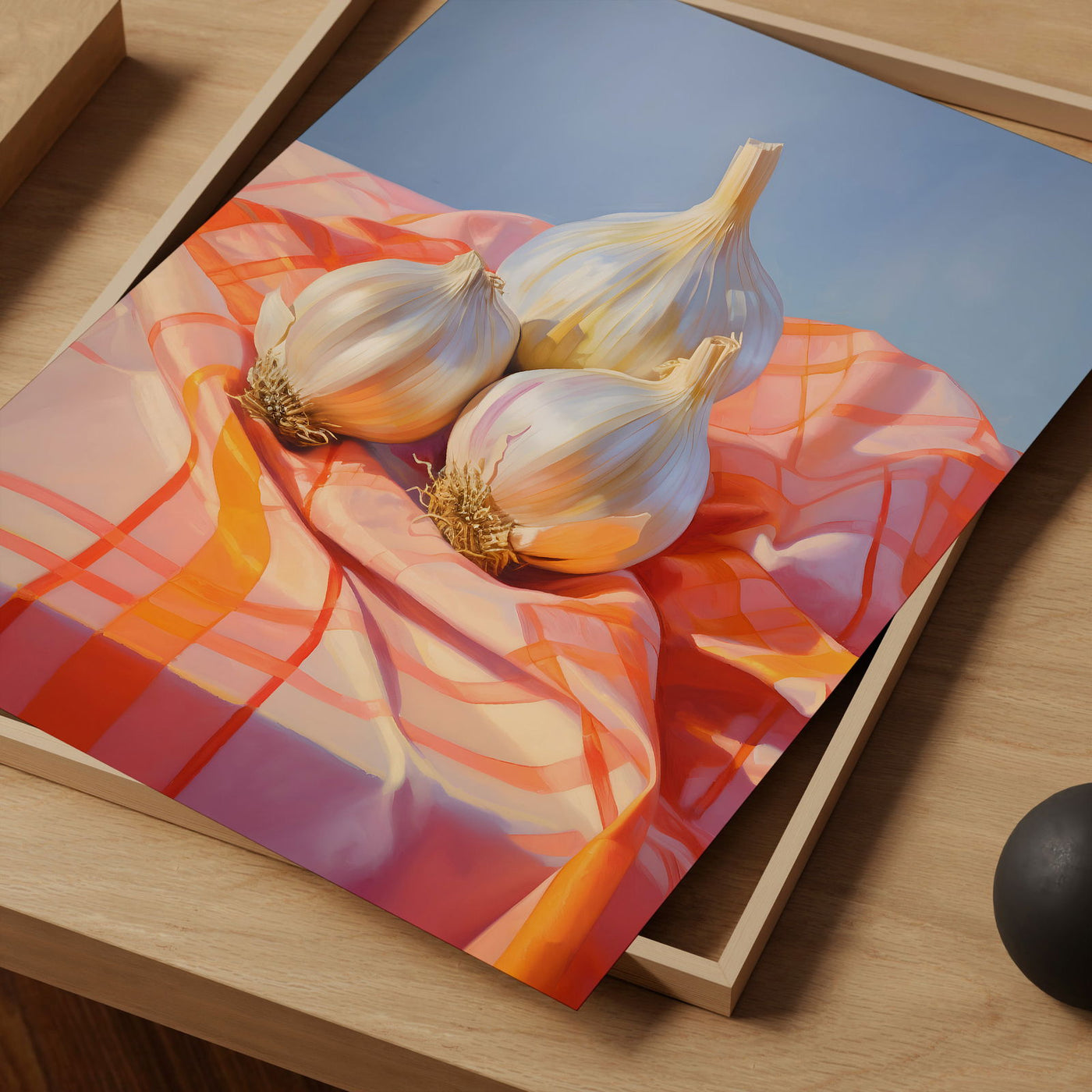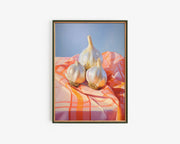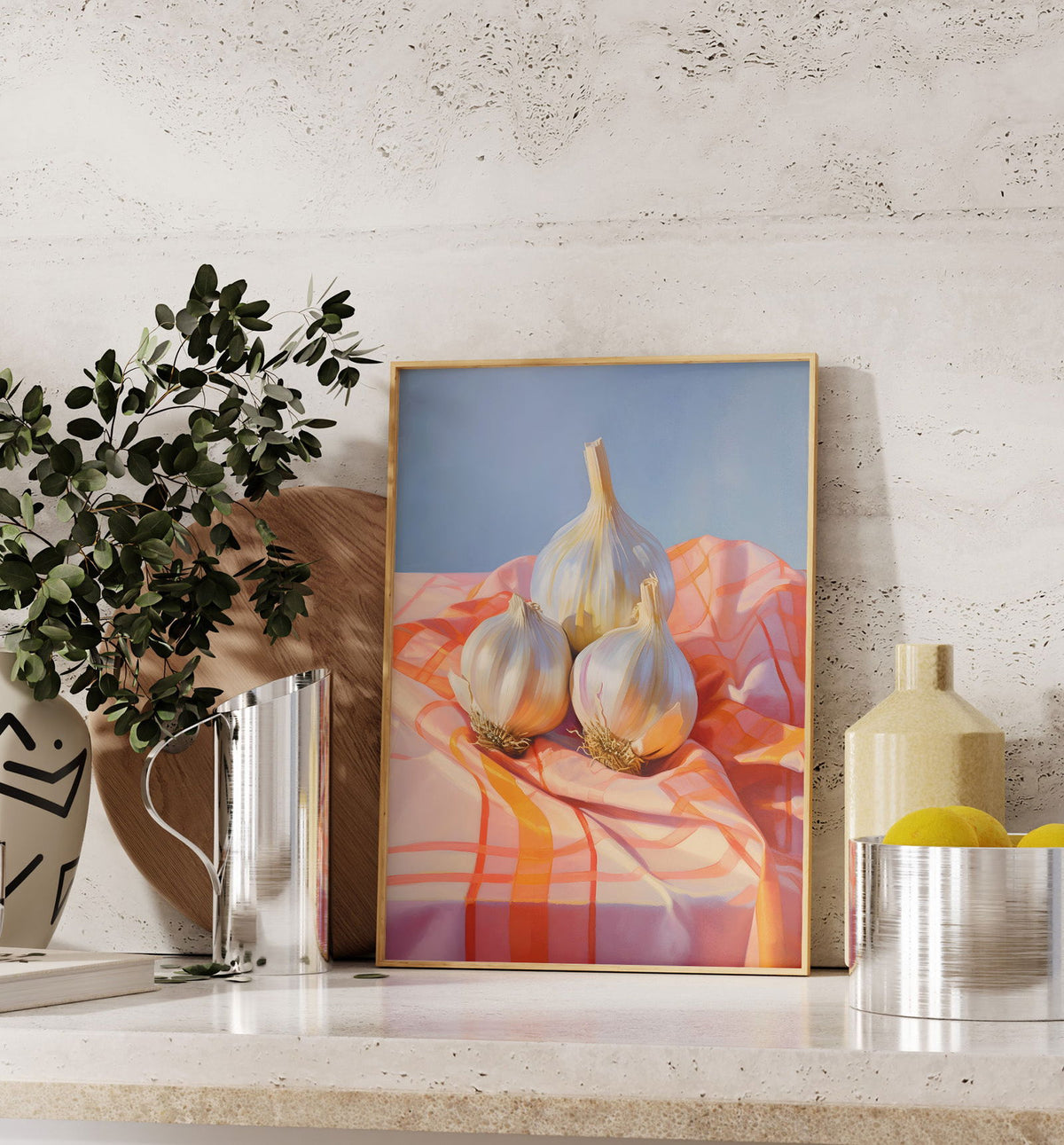 Orange Gingham Kitchen Print, Garlic Italian Food Poster - Fine Art Paper / 8x10 / No Frame